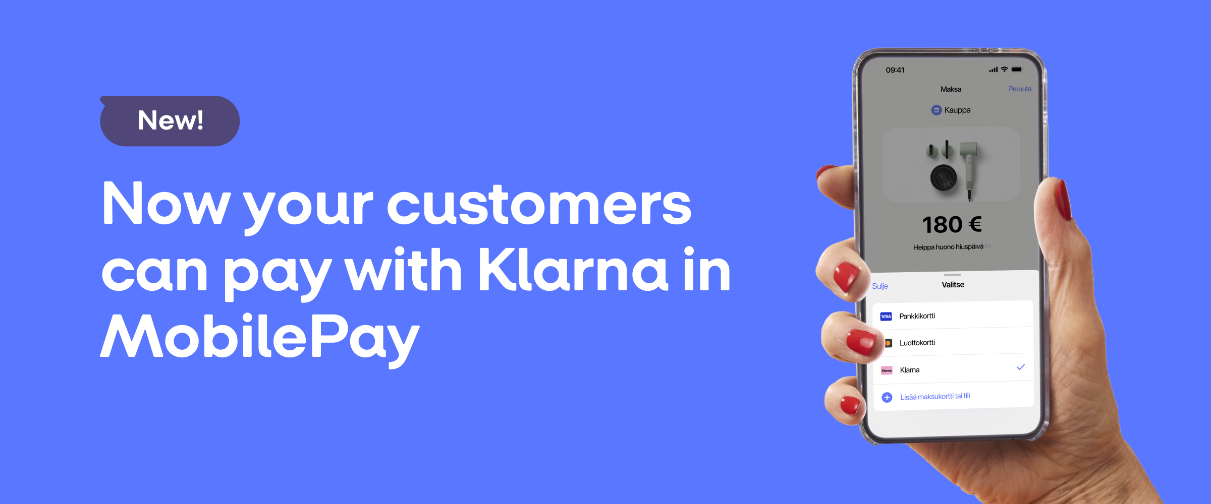 MobilePay users should be free to choose how they want to pay – and with more and more Finns using Klarna, it’s no surprise we’ve been asked when we’ll add more flexibility. The answer? Now! With Klarna, your customers can choose to buy now and pay later. Klarna can be used for all purchases made through MobilePay – except for payments on card terminals or recurring payments.