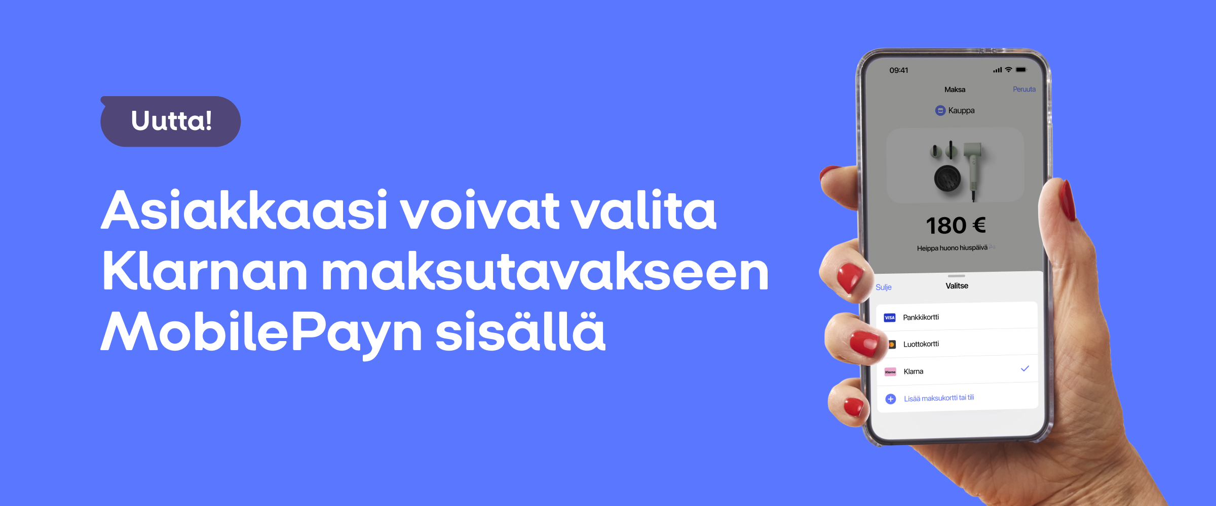 MobilePay-käyttäjät voivat nyt valita itse, millä tavalla he haluavat maksaa ostoksensa. Lähes 2,5 miljoonaa suomalaista Klarna-käyttäjää voivat nyt yhdistää Klarnan MobilePay-sovellukseensa ja maksaa yrityksille Klarnalla MobilePayn sisällä heti tai myöhemmin. Klarna on käytössä MobilePay-ostoksiin kaikissa muissa tilanteissa paitsi lähimaksuissa ja toistuvissa maksuissa.
